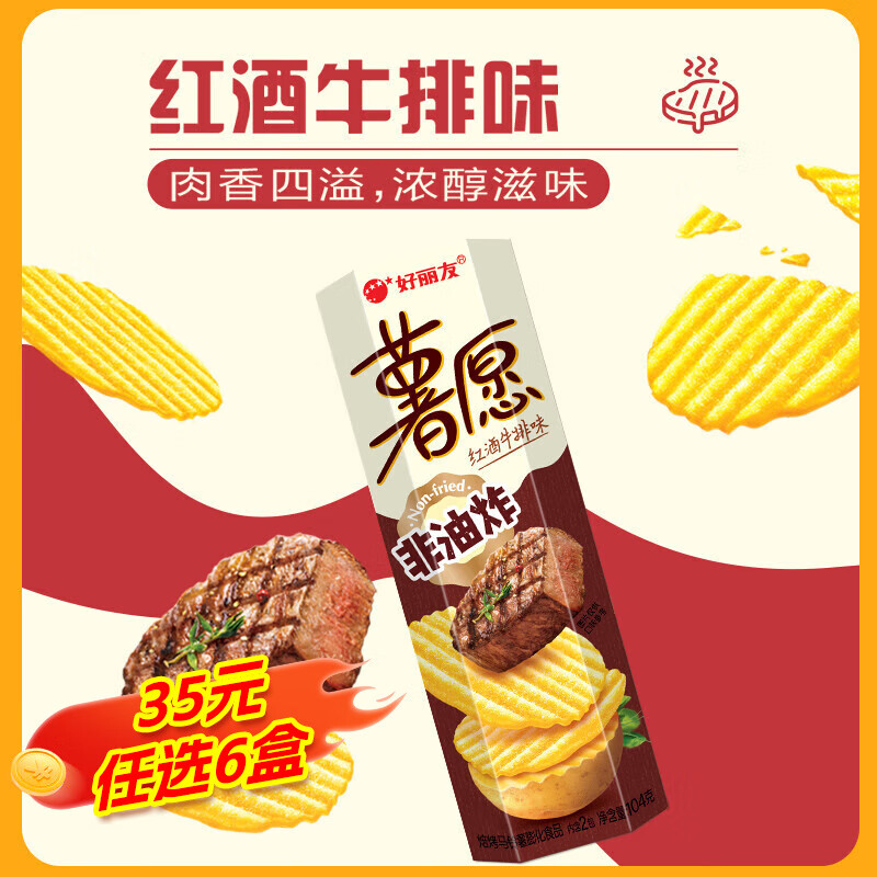 好丽友薯愿薯片多口味非油炸薯片小包装办公室解馋膨化零食小吃休闲104g 【红酒牛排味】104g*1盒