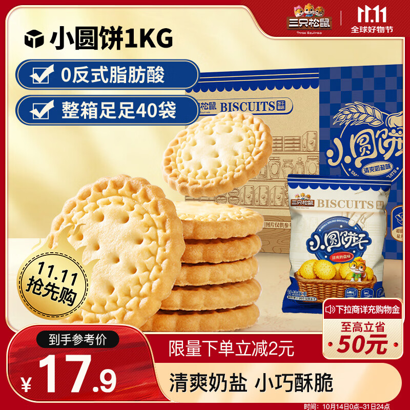 三只松鼠小圆饼奶盐味1000g 休闲零食网红饼干糕点早餐下午茶40袋