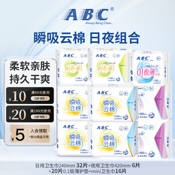 ABC纤薄卫生巾 瞬吸云棉 棉柔舒爽透气不闷姨妈巾日用夜用组合囤货装 日夜加长+护垫+迷你巾9包74片