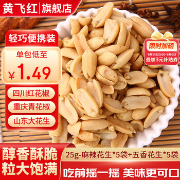 黄飞红麻辣花生米办公室休闲零食露营聚会黄飞鸿下酒菜坚果炒货25g/袋 麻辣*5袋+五香*5袋