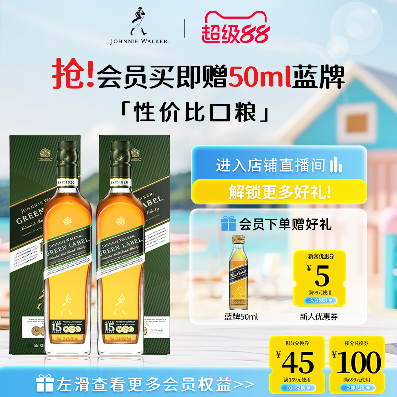 【官方旗舰店】尊尼获加绿牌绿方苏格兰威士忌750ml双支组合