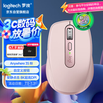 罗技(Logitech)大师系列 MX Anywhere 3S 静音鼠标 无线蓝牙双模鼠标 商务办公 便携鼠标 茱萸粉 接收器另购