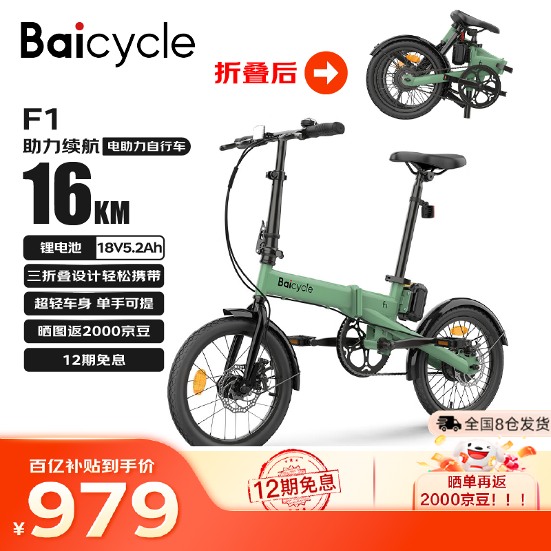 BAICYCLE小白F1小米生态链三折叠电助力自行车超轻时尚便携可拆卸锂电池电动单车小型校园通勤代步学生男女