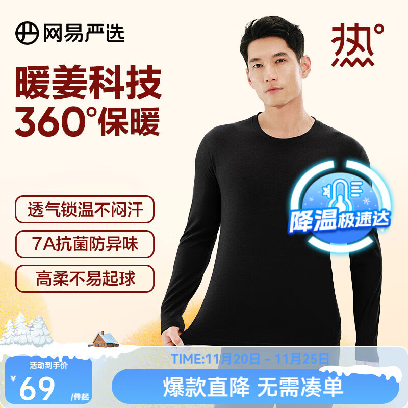 网易严选新品热咖302暖姜保暖内衣240g重磅7A抗菌柔软透气不闷汗秋衣秋裤 B款230g-水墨黑-男 L