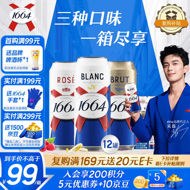 kronenbourg 1664三口味500ml*12罐(白啤+桃红+法蓝)精酿啤酒喜酒混合装京东自营
