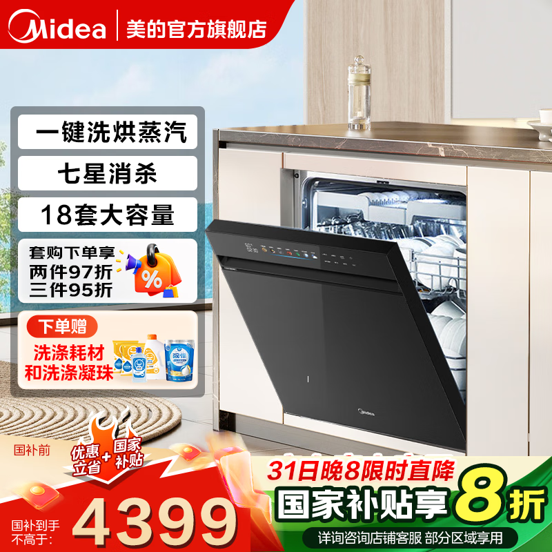 美的(Midea)洗碗机嵌入式18套 全自动家用厨房家电 UV杀菌蒸汽消毒 一键洗烘 105℃热风烘干不锈钢 【简约黑X6S Max】变频万向全腔洗