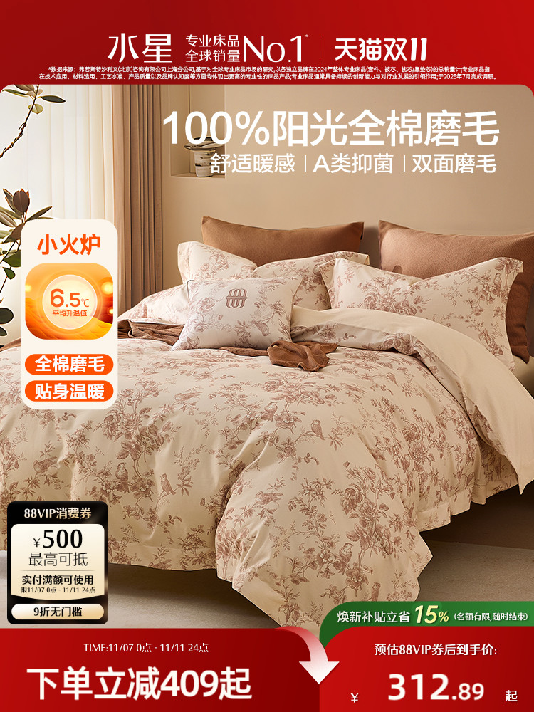 水星家纺全棉磨毛四件套纯棉抗菌加厚保暖床上用品秋冬天床单被套