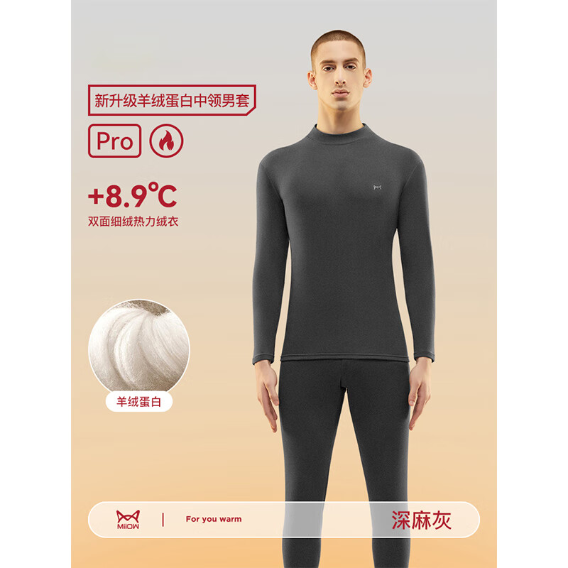 猫人(MiiOW)男士无痕保暖内衣男厚款双面热力绒润肤打底男款秋衣秋裤套装 中领-深麻灰【羊绒蛋白保暖】 XL 【建议重120-140斤】