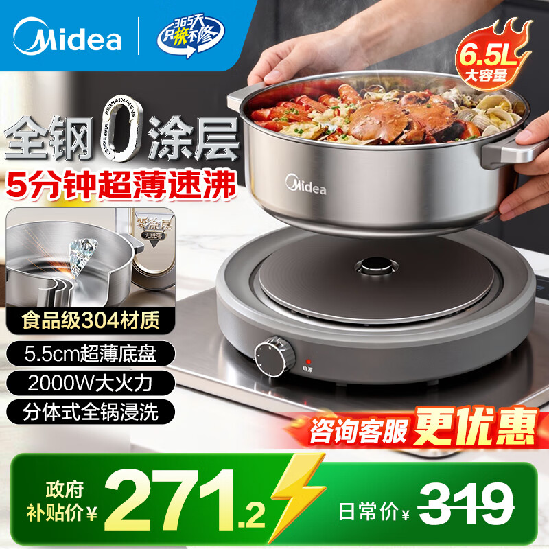 美的(Midea)全钢0涂层电火锅家用5-8人 6.5L超薄火锅专用锅304不锈钢电煮锅多人涮炖煮多功能料理锅 6.5L MC-HGS30G1 0涂层全钢丨3分45秒超薄速沸