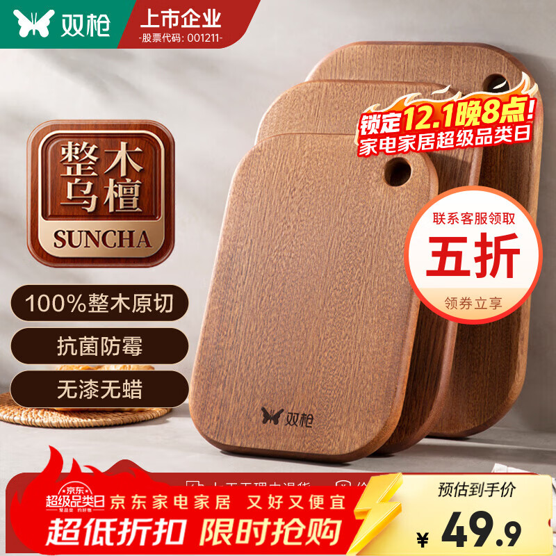 双枪乌檀木整木菜板家用抗菌防霉小案板实木切菜板婴儿水果砧板辅食板 【适用1-2人】小号30*20*2cm(整木加厚)