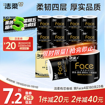 洁柔有芯卷纸 黑Face加厚4层180克*23卷 厚韧耐用 大克重卫生纸巾整箱
