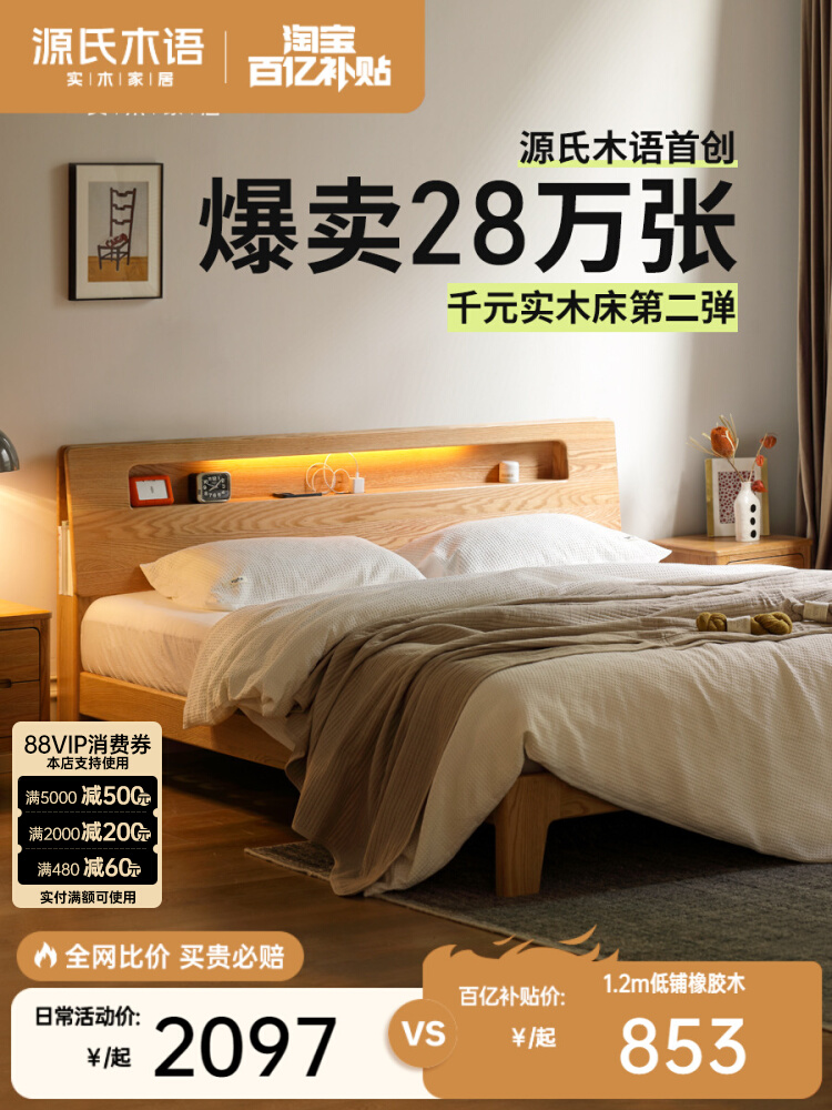 源氏木语全实木床卧室1.8橡木北欧床现代简约1.5米主卧双人床家具