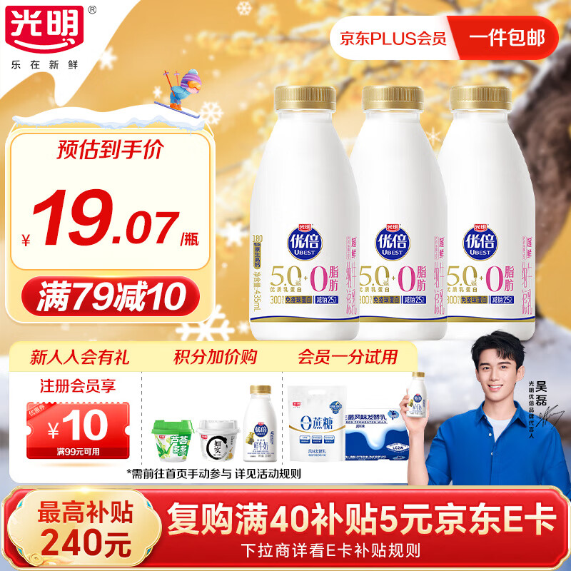 光明优倍5.0超鲜牛奶(0脂) 435ml*3瓶【吴磊推荐】75℃巴氏杀菌