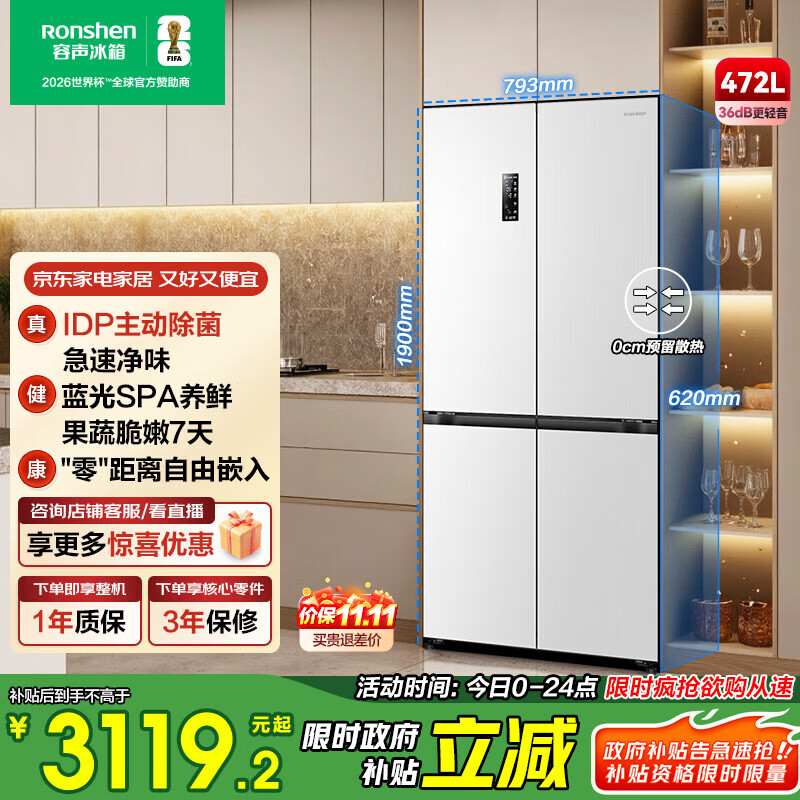 容声472L十字门电冰箱IDP净味超薄零嵌入式一级能效风冷无霜节能变频BCD-472WD3FPLA白国家补贴