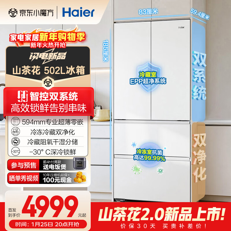 海尔(Haier)山茶花「485升级」502L法式多门冰箱双系统双净化超薄零嵌一级能效风冷无霜BCD-502WGHFDC4FBU1