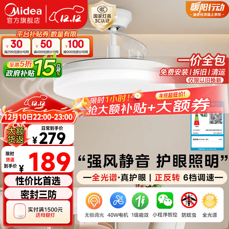 美的(Midea)风扇灯一体餐厅吊扇灯led卧室隐形扇叶三防护眼灯具熟睡风包安装
