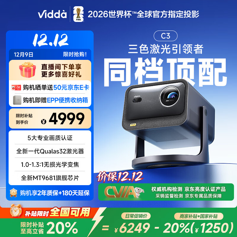 自营Vidda C3 海信4K超高清三色激光投影仪家用投影机 无损光学变焦+MT9681高阶芯片 智能家庭影院国家补贴