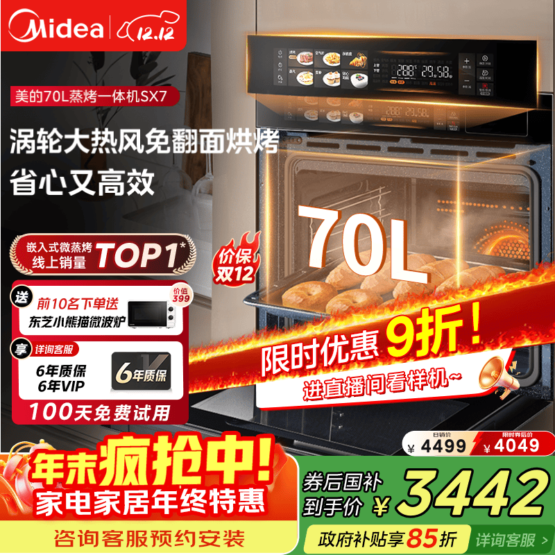 自营美的70L大容量嵌入式蒸烤箱一体机 航空涡轮热风 温湿双控 13.4英寸大彩屏 蒸烤炸炖4合1体SX7