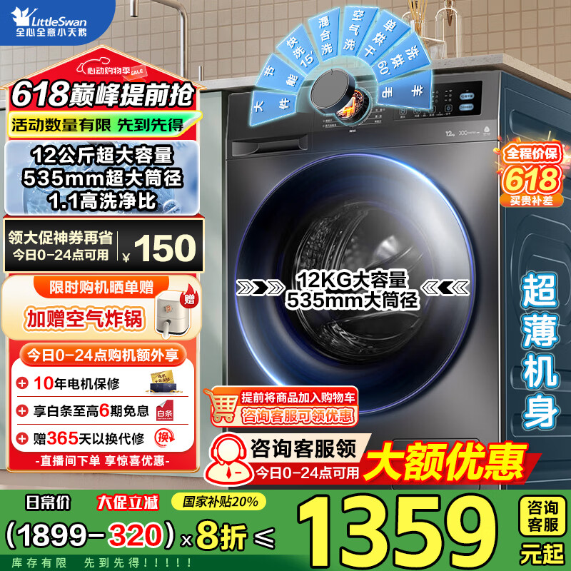 旗舰店小天鹅(LittleSwan)滚筒洗衣机 12公斤大容量 洗脱/洗烘一体带烘干 全自动家用1.1洗净比变频一级能效家电国家补贴 【12公斤无烘干V20】蒸汽消毒洗+APP远程智控