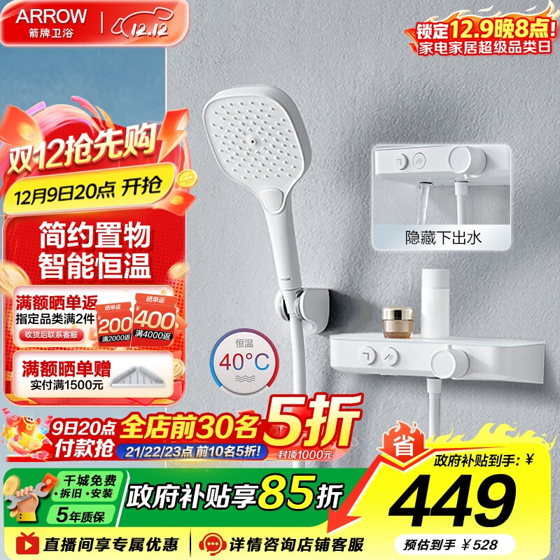 旗舰店箭牌(ARROW)双功能淋浴花洒套装置物平台分体式淋浴花洒增压喷头F300简易花洒 F300哑光白AE3252恒温分体置物款