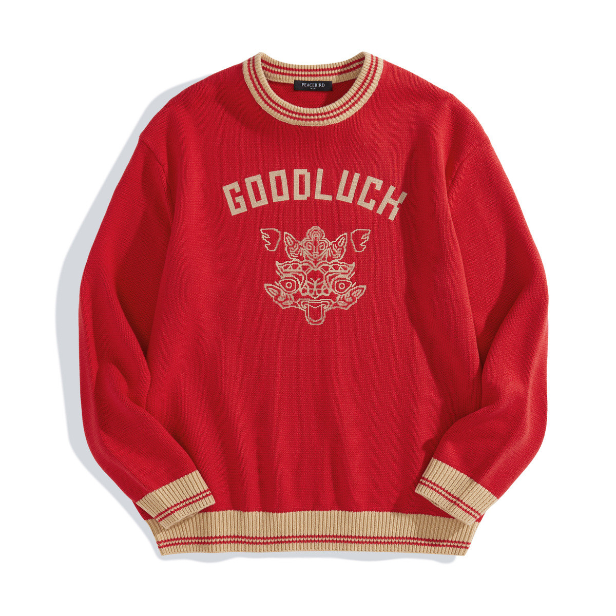 太平鸟 男装春款圆领撞色拼接字母龙纹提花味针织衫长袖男式毛衣
