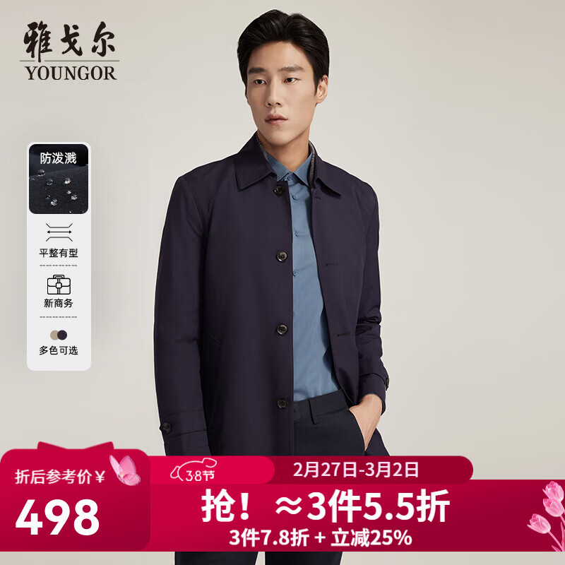 旗舰店雅戈尔(YOUNGOR)风衣男翻领单风衣锦纶耐穿舒适透气男士上衣外套 GYDF424995FQA藏青色 M 170/92A