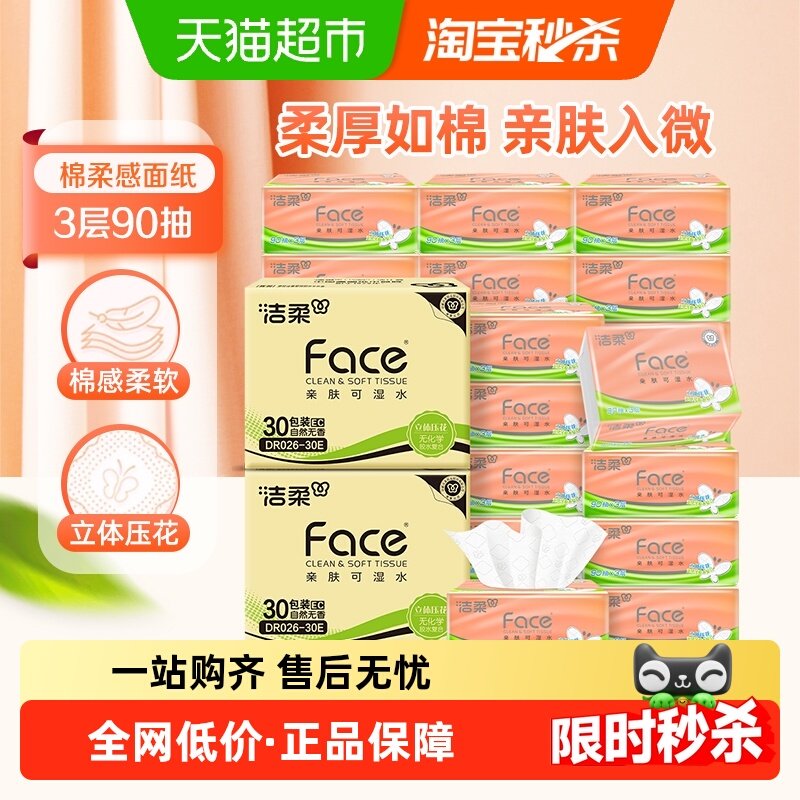洁柔抽纸棉柔感立体压花3层90抽60包面巾纸卫生纸整箱实惠装加厚