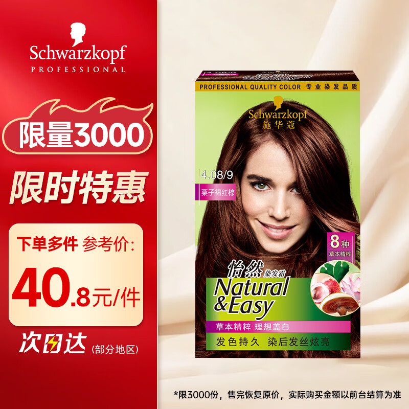 自营施华蔻怡然植物染发霜4.08/9栗子褐红棕(草本染发剂染发膏男女士盖白发)