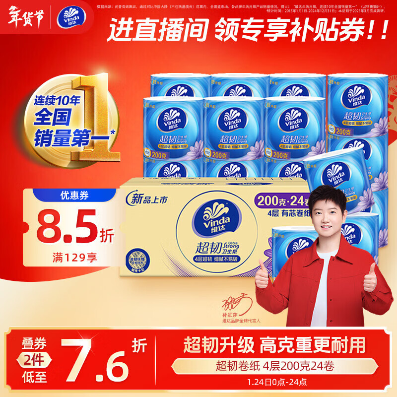 自营维达(Vinda)有芯卷纸【孙颖莎推荐】超韧4层200克*24卷 高克重卫生纸厕纸整箱