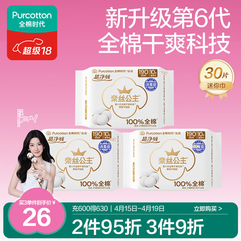 自营全棉时代【卢昱晓推荐】奈丝公主消毒级超净吸姨妈巾迷你巾3包(190*30p)