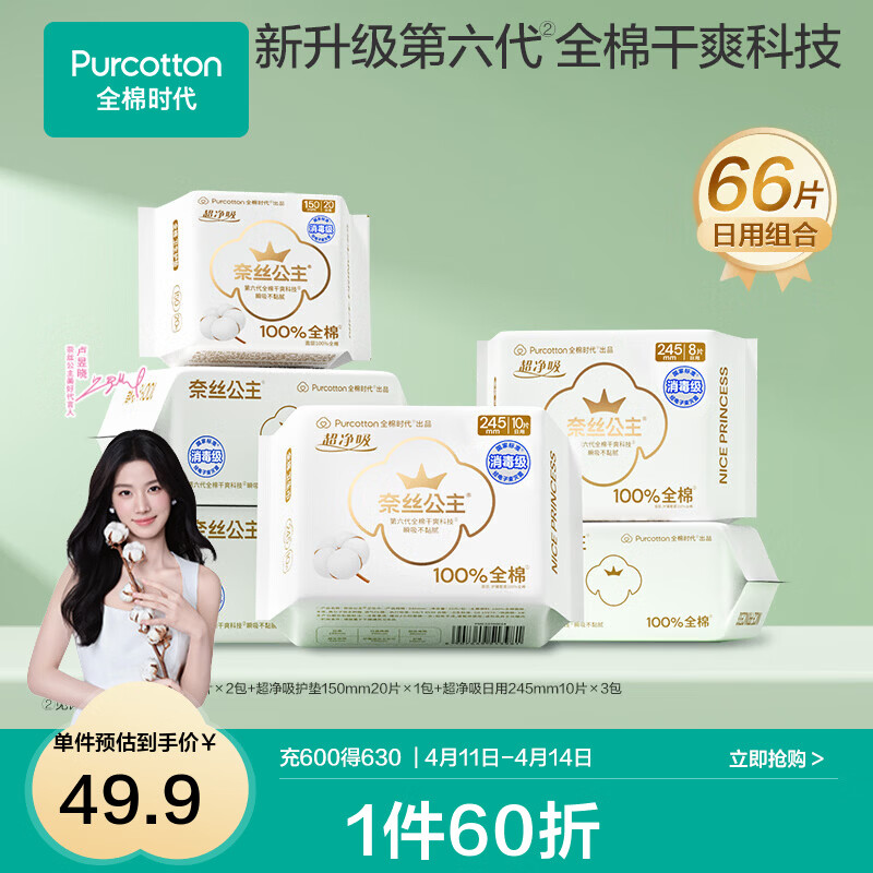 旗舰店全棉时代【代言人卢昱晓推荐】消毒级纯棉面层卫生巾日用组合干爽透气 消毒级超净吸日用组合66片