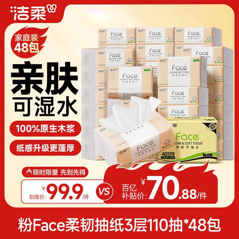 自营洁柔抽纸 粉Face3层110抽*48包 可湿水纸巾卫生纸 柔韧抽纸 整箱纸巾