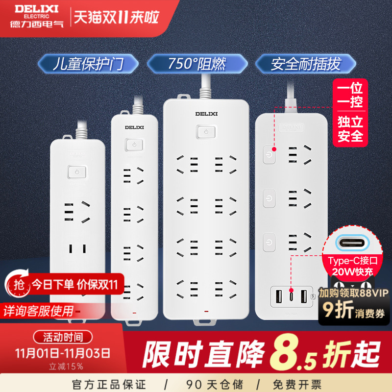 旗舰店德力西插座插排插线板拖线板插板带线家用多功能正品转换器多用T