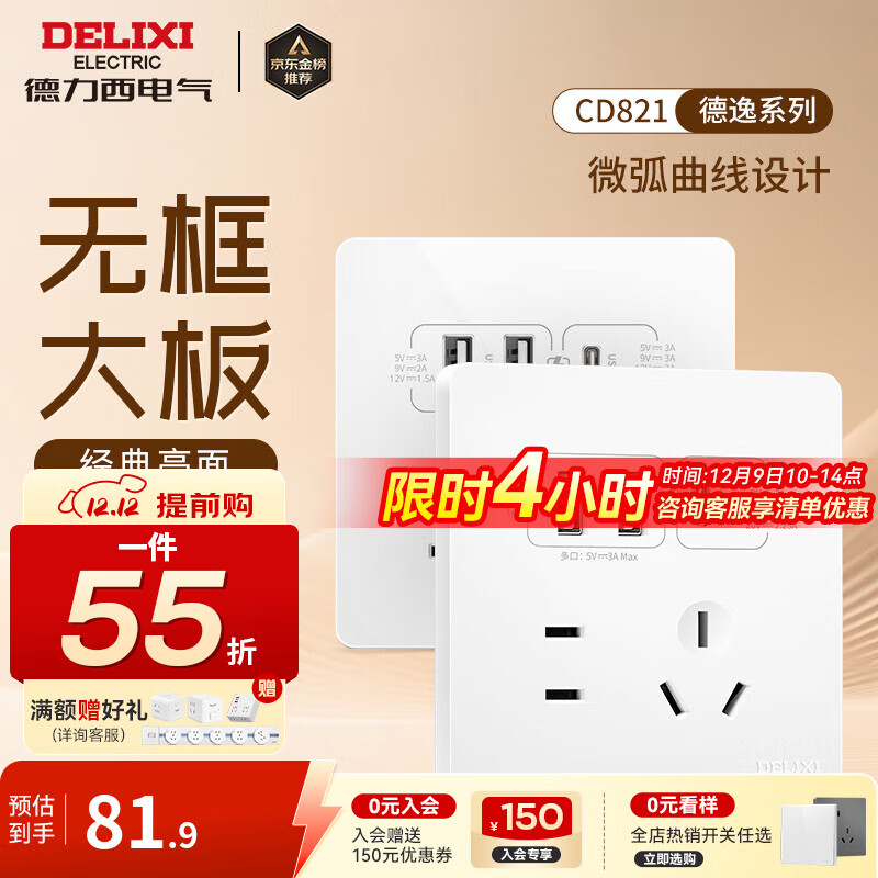 旗舰店德力西(DELIXI) 开关插座面板快充五孔CD821通用USB+type-c双口45W插座86型面板 45W快充type-c+USB(时尚白色)