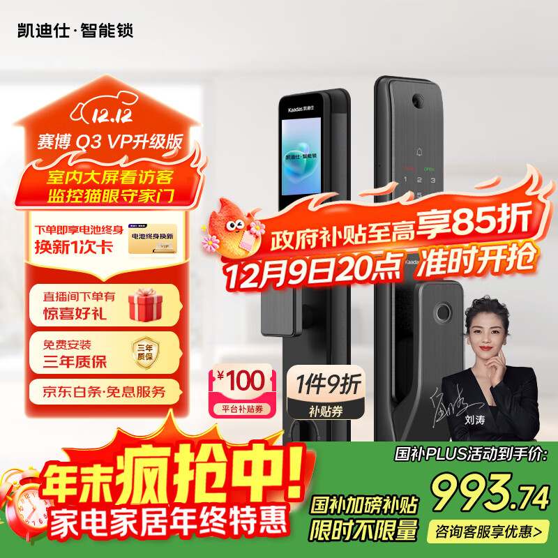 自营凯迪仕(kaadas)智能锁 可视猫眼高清大屏指纹识别 电子锁智能指纹锁 Q3 VP升级版