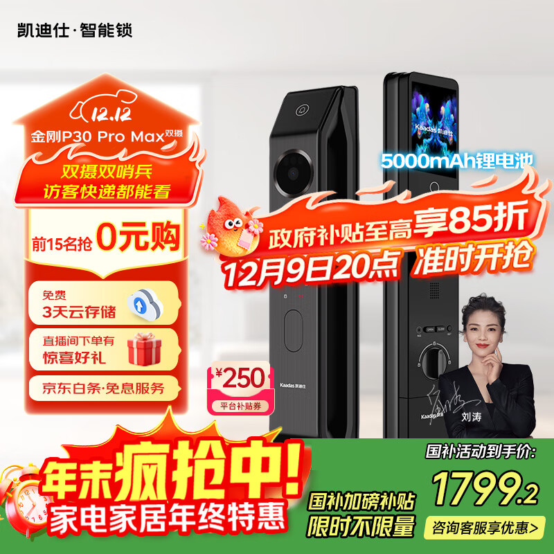 自营凯迪仕(kaadas)智能门锁 双摄人脸识别可视猫眼大屏指纹锁 金刚P30 Pro Max双摄