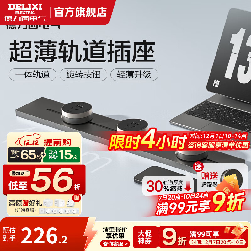 旗舰店德力西【全新升级】超薄轨道插座可移动明装8000W大功率插线板厨房导台 【超薄云界丨铝轨+童锁】灰色50cm+3