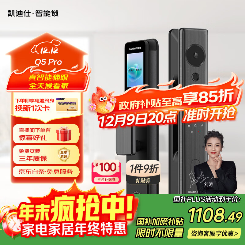 自营凯迪仕(kaadas)智能锁 可视猫眼高清大屏指纹识别 电子锁智能指纹锁 Q5 Pro