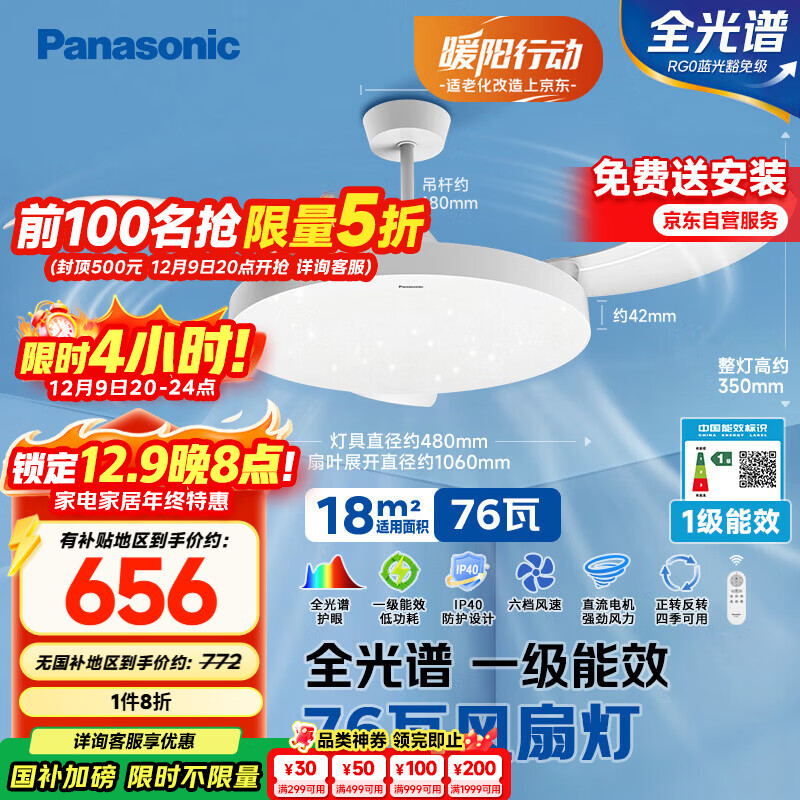 自营松下(Panasonic)风扇灯IP40全光谱护眼76瓦LED照明42寸风扇灯 HHLZ5000
