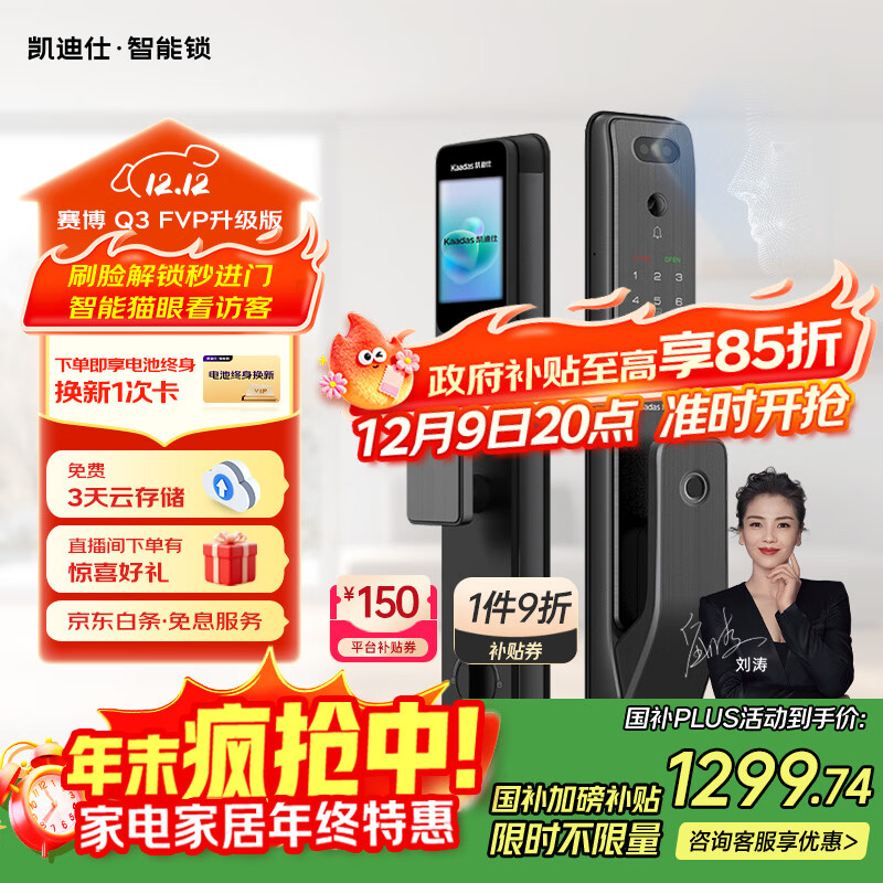 自营凯迪仕(kaadas)智能锁 可视猫眼大屏人脸识别 智能门锁指纹锁 赛博Q3 FVP升级版