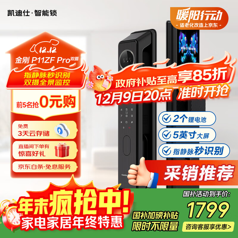 自营凯迪仕(kaadas)智能门锁人脸识别猫眼监控可视大屏指静脉智能锁P11ZF Pro双摄