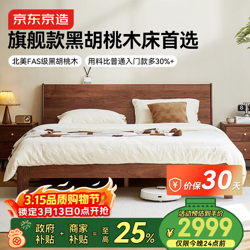自营京东京造南山南实木床 北美黑胡桃木斜靠床头 轻奢主卧双人床1.8×2米