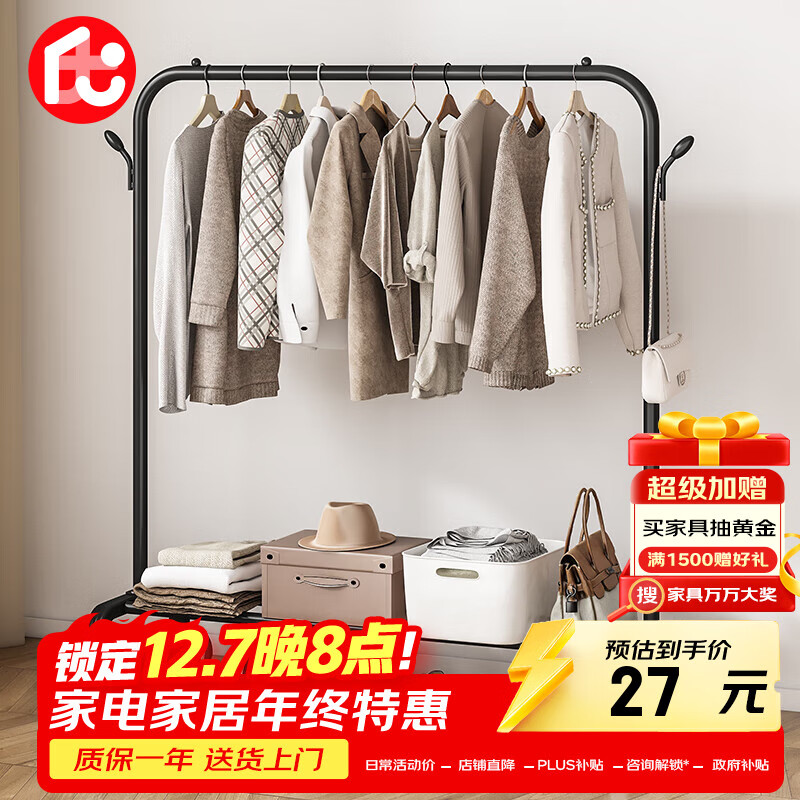 自营喻品衣架落地衣帽架挂衣架卧室客厅晾衣杆晒衣架可置物加粗MJ53黑100