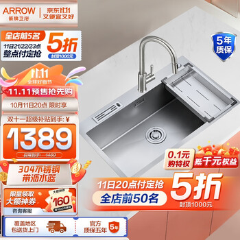 旗舰店箭牌(ARROW) 厨房卫浴手工纳米水槽加厚304不锈钢一体盆洗碗池洗菜盆大单槽 B款含沥水篮,75*45,抽拉