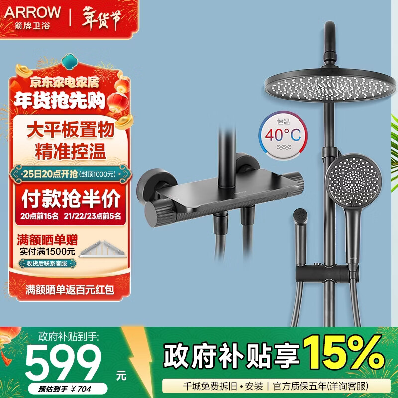 旗舰店箭牌(ARROW)按键恒温淋浴花洒套装冷热沐浴龙头增压易洁喷枪顶喷暗装花洒全套 四功能平板恒温花洒黑34120HMB