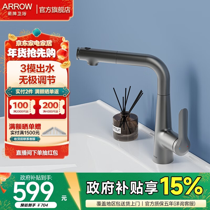 旗舰店箭牌(ARROW) 面盆水龙头冷热抽拉式低身漱口龙头水浴室卫生间单孔洗脸池龙头 枪灰-升降抽拉龙头AE41110GG