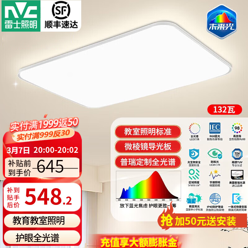 旗舰店雷士(NVC)全光谱LED护眼背光未来光吸顶灯智能客厅卧室书房儿童灯具轻辰 【未来光-轻辰】132W全光谱