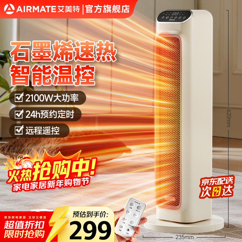 旗舰店艾美特(AIRMATE)取暖器家用暖风机石墨烯即热智能控温节能远程遥控电暖气立式80度摇头3档可拆洗倾倒断电 【2100W石墨烯+智能温控】HP21-R27