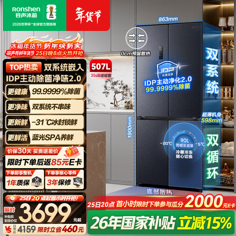 自营容声IDP净味507L十字门冰箱主动除菌双系统超薄零嵌入式一级能效风冷无霜BCD-507E50CZLAD国家补贴