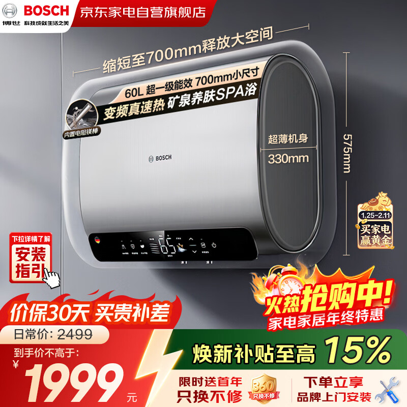 自营博世德国电热水器上门安装家用60升一级能效专利防电墙活水抑菌水质可视双胆速热养肤浴S7